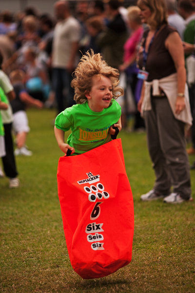 The sack race was Rebekah’s penultimate event. Sacks have changed a little from my day, when brown cotton versions were the order of the day.