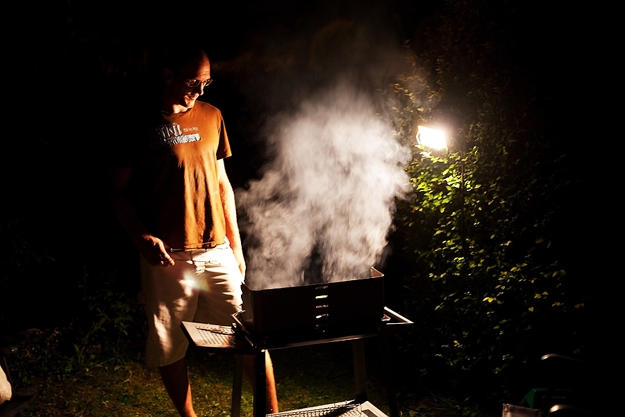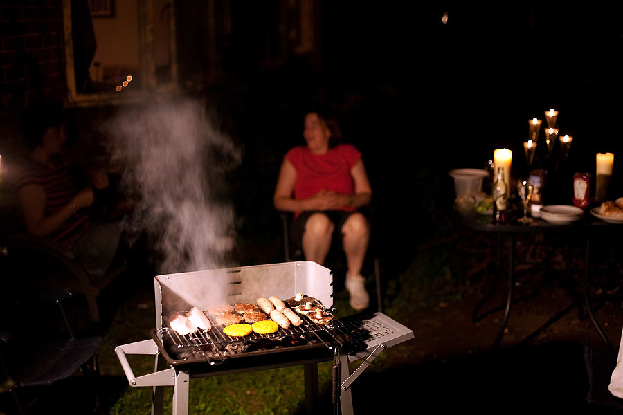 Fortunately I was able to dig out an old floodlight which we eventually rigged up by hooking it onto a parasol stand wedged into the hedge.  This then provided ample illumination for cooking by.