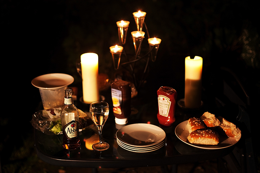 Other lighting, provided by candles, gave some definition to the food, plates and glasses on the table.