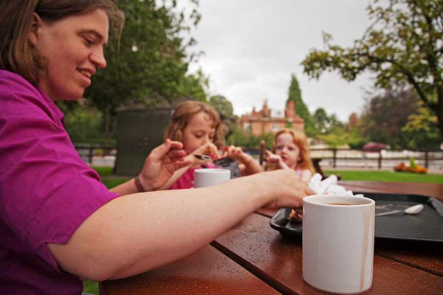 We managed to find a gap in the rain while we ordered our refreshments from the small kiosk and selected, although onlookers on the island would have witnessed the ungainly sight of me attempting to break into a jog while carrying a tray of drinks shortly after sitting down at a table as the rain began again!