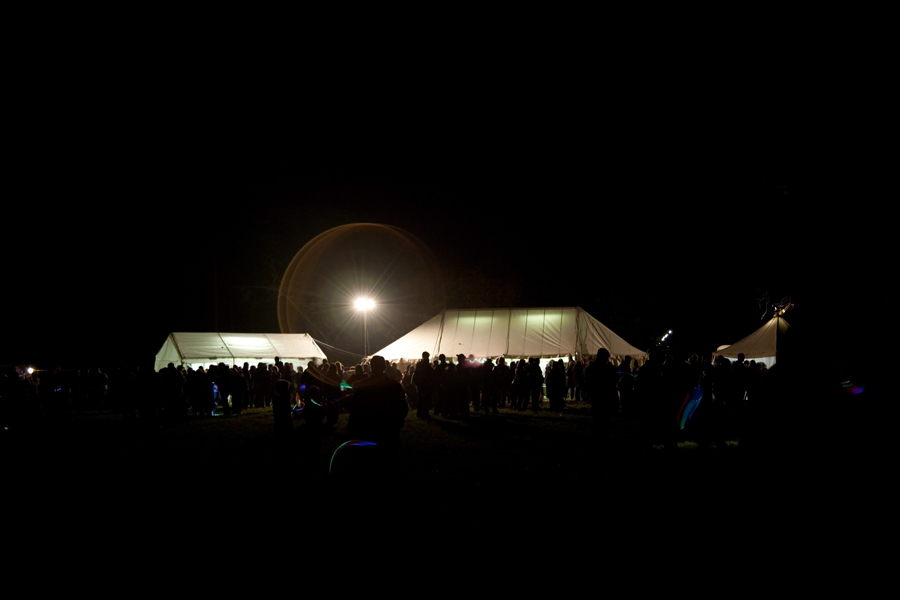 The tented area was illuminated leaving most of the meadow, including the bonfire, in darkness.
