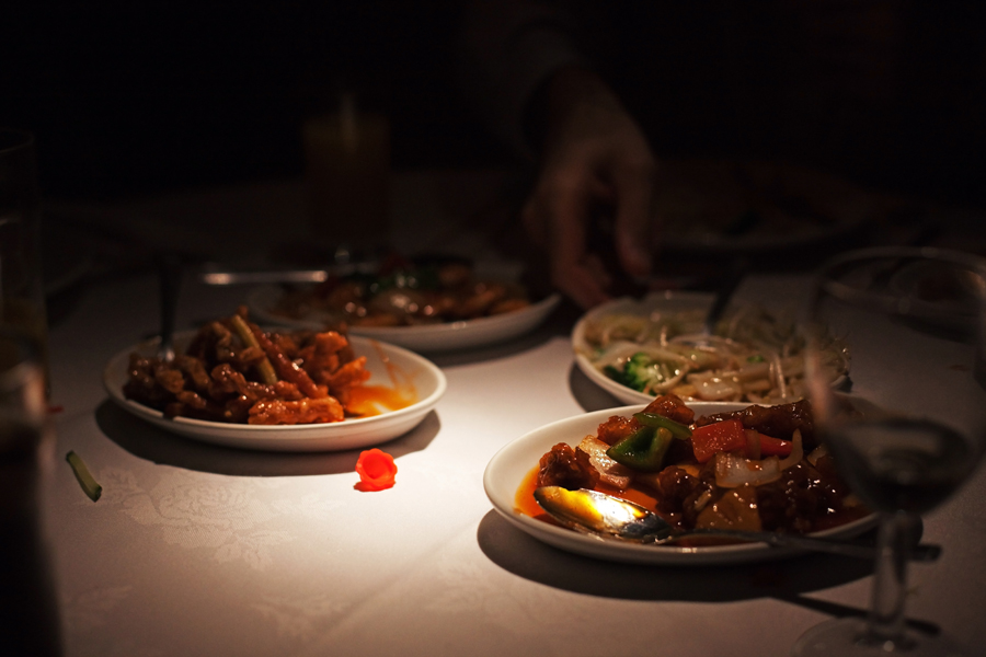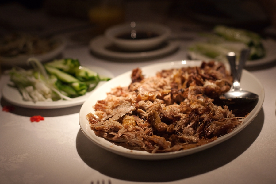 The ‘starters’ consists of a variety of dishes served on a communal platter. This is followed by a ‘main course’ of duck pancakes. Finally, rice accompanied by various dishes topped off the meal.