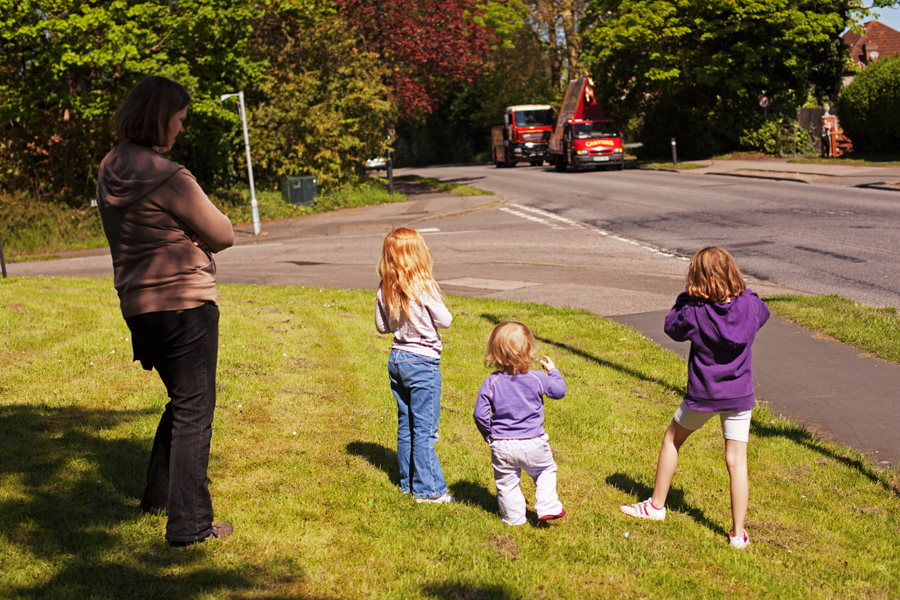 We waited on the sunlit grass just up the road from our house and eventually our ears were rewarded by the distant sound of horns beeping. Finally the parade, somewhat disjointed and mixed up with other vehicles, hoved into view, led by a van decked out with advertisements for the fair.