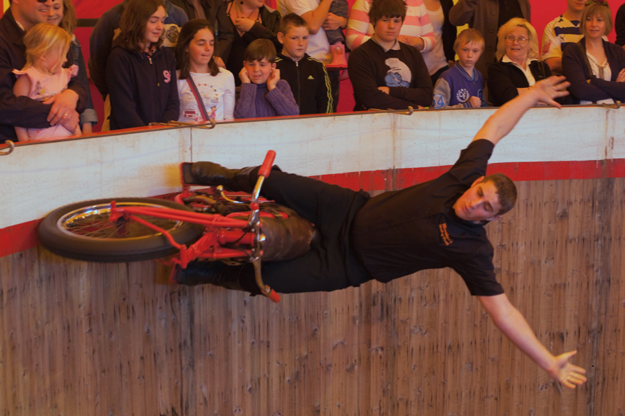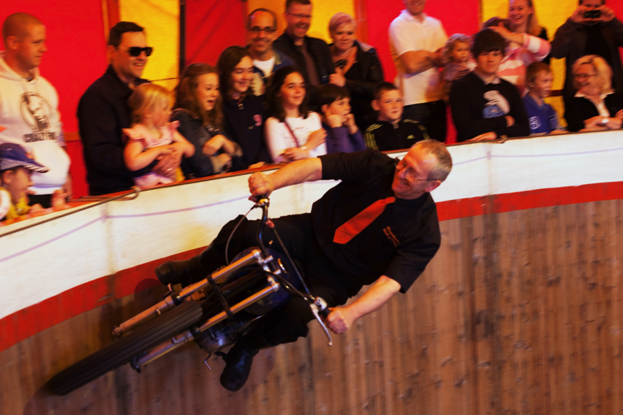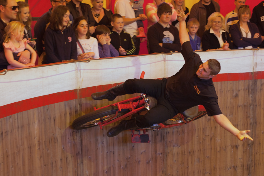 After some preamble, the expertly ridden motorbikes hurtled around the vertical wooden walls of the arena while I frantically clicked away with the camera in a vain attempt to get a half-decent shot. Rebekah and Holly enjoyed the performance, although Holly said it was ‘very loud’!
