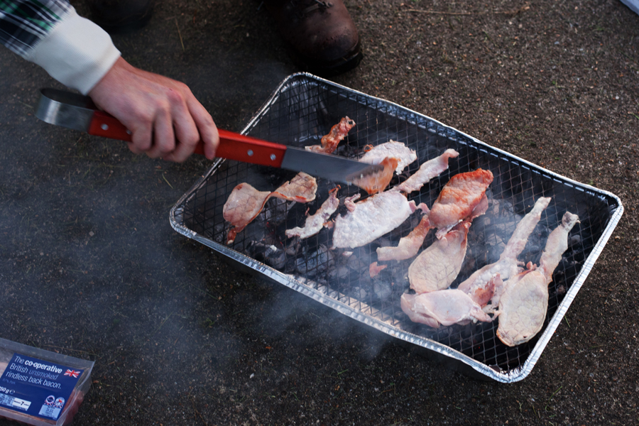 Eventually, with dawn fast approaching, Sean was able to lay rashers of bacon atop the bbq and soon the delicious aroma of bacon cooking filled the air.