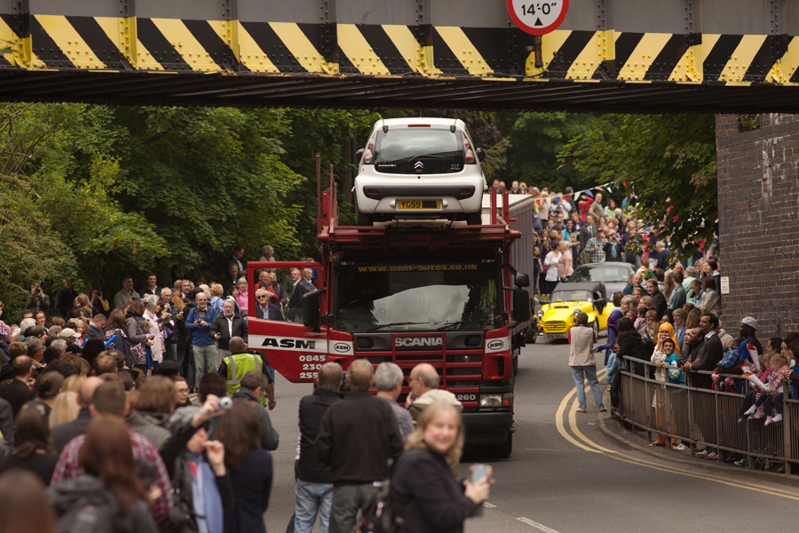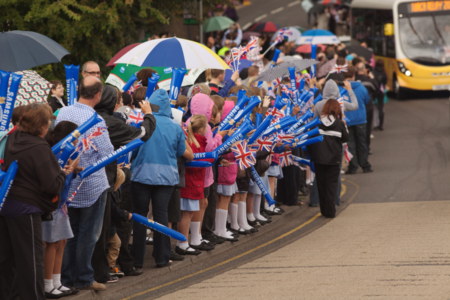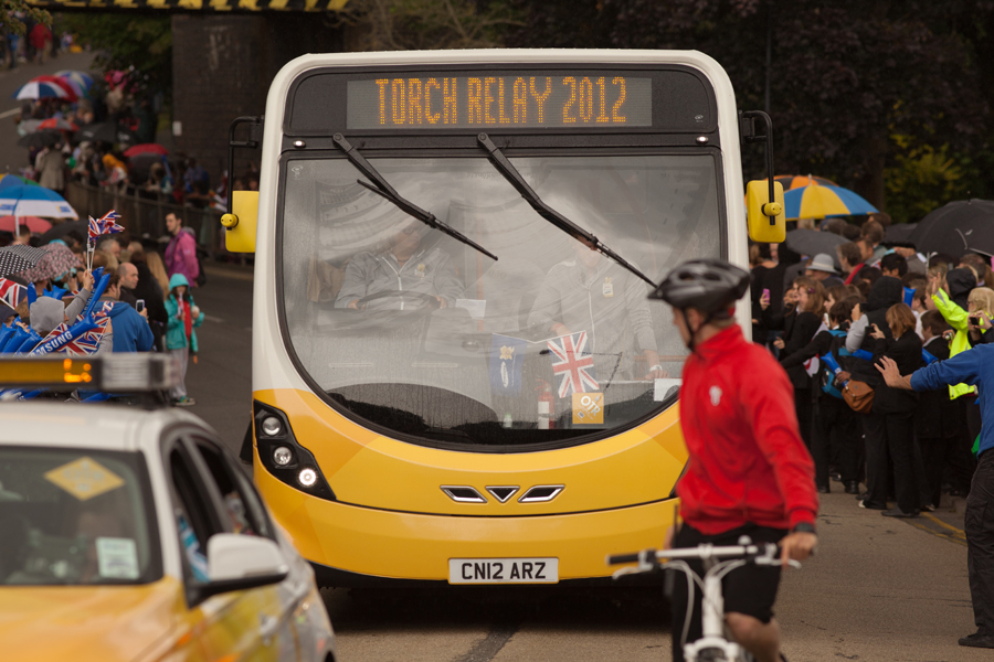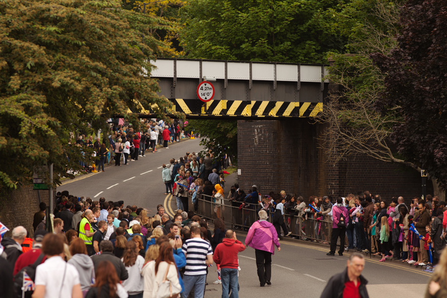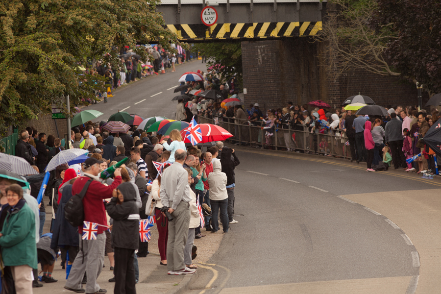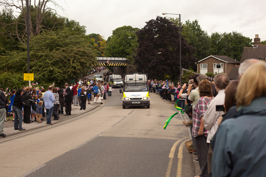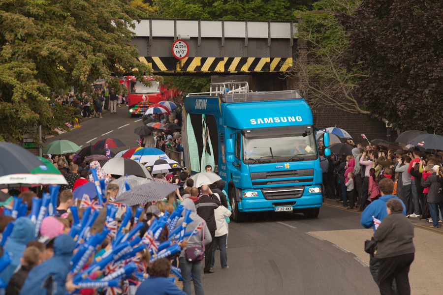 We were in position around half an hour before the torch was due to arrive. Amazingly, despite the signs, the road still appeared to be open and a car transporter had an embarrassing time after realising that his vehicle was slightly too tall to pass under the bridge. He had to reverse back up the hill – in front of a few hundred people!